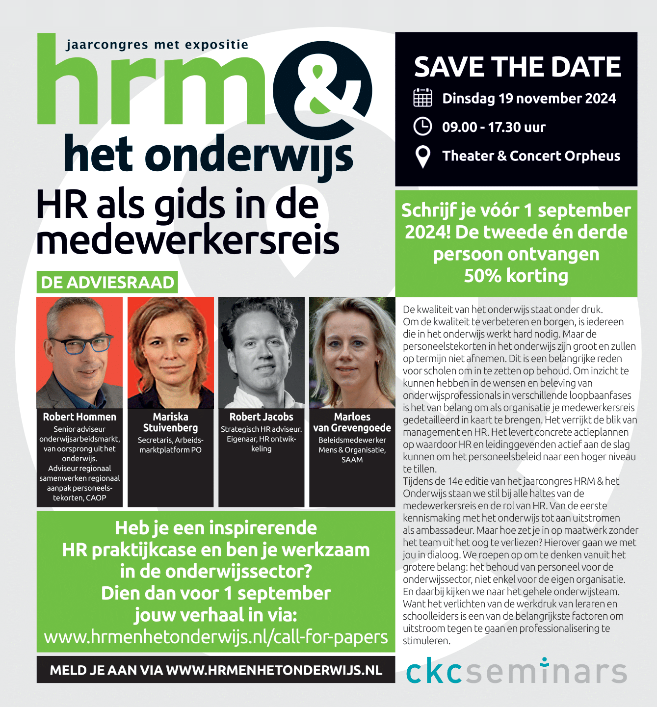 Tijdens de 14e editie van het jaarcongres HRM & het Onderwijs staan we stil bij alle haltes van de medewerkersreis en de rol van HR. Van de eerste kennismaking met het onderwijs tot aan uitstromen als ambassadeur. Maar hoe zet je in op maatwerk zonder het team uit het oog te verliezen? Hierover gaan we met jou in dialoog. We roepen op om te denken vanuit het grotere belang: het behoud van personeel voor de onderwijssector, niet enkel voor de eigen organisatie. En daarbij kijken we naar het gehele onderwijsteam. Want het verlichten van de werkdruk van leraren en schoolleiders is een van de belangrijkste factoren om uitstroom tegen te gaan en professionalisering te stimuleren.